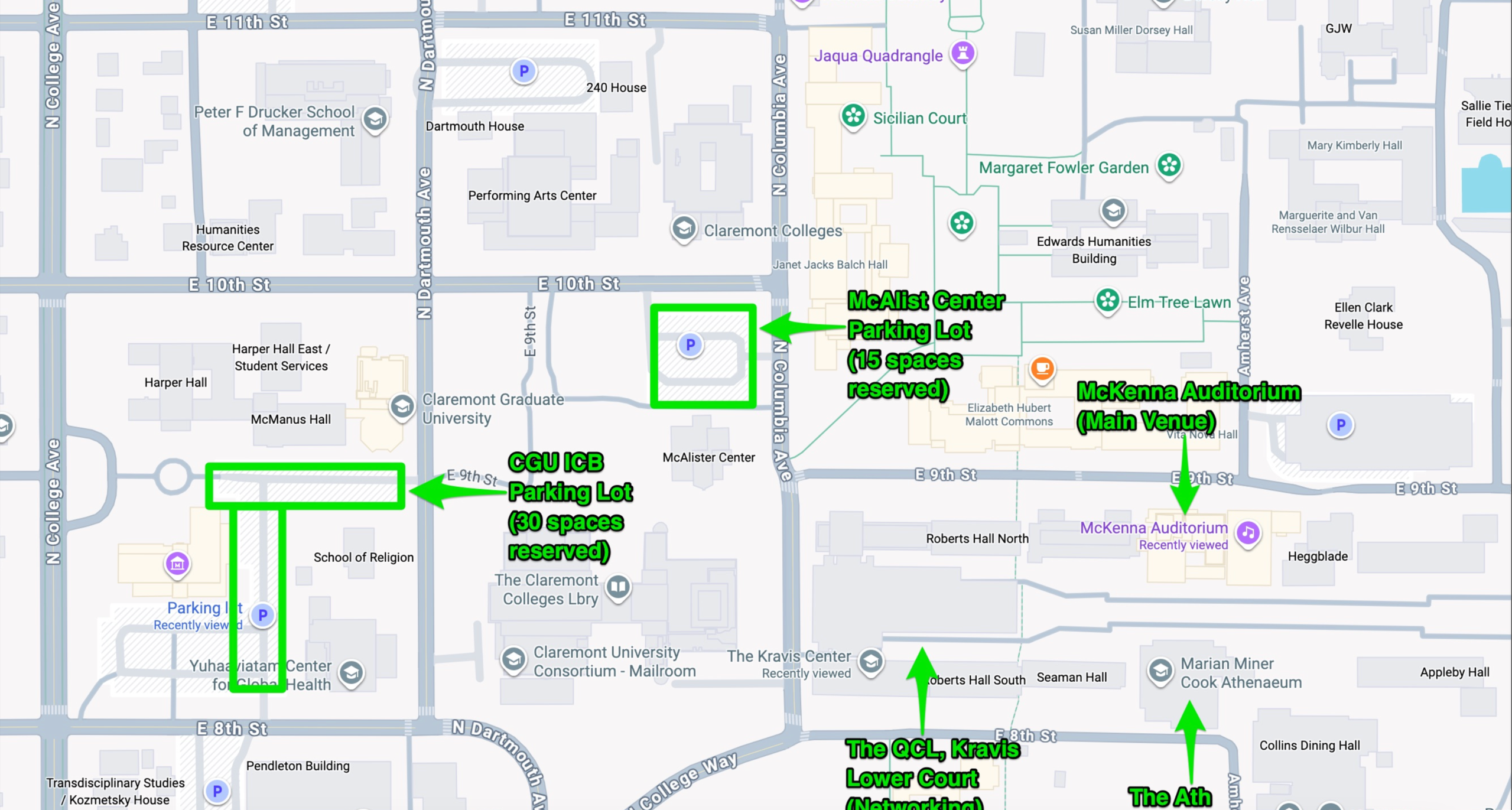 Reserved Parking Lot 1 (15 spaces): McAlister Center Parking Lot, 919 N Columbia Ave, Claremont, CA 91711